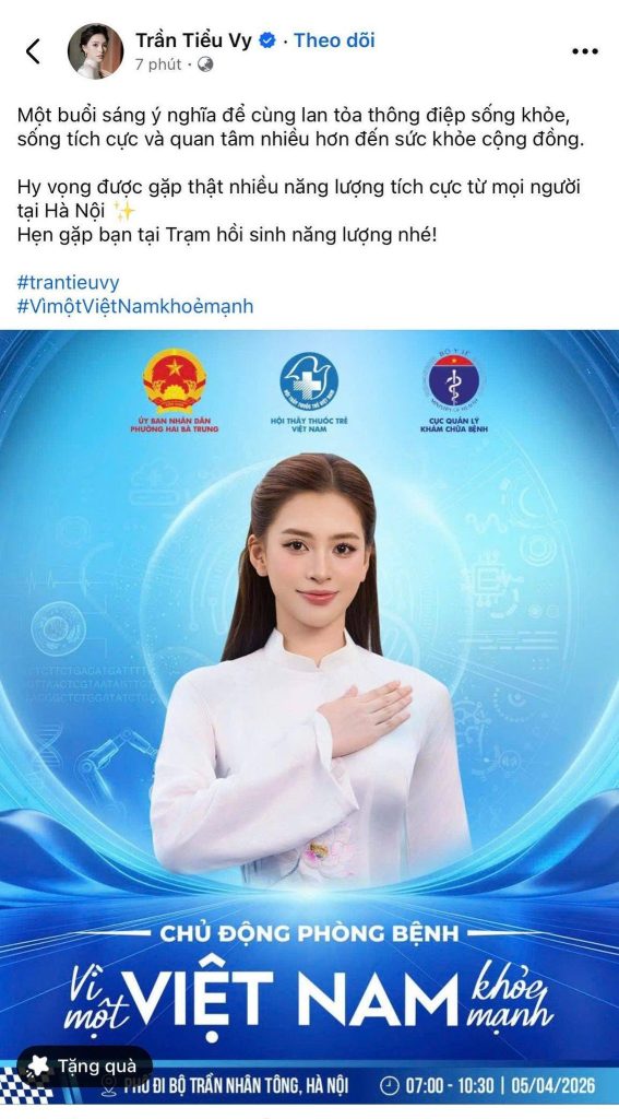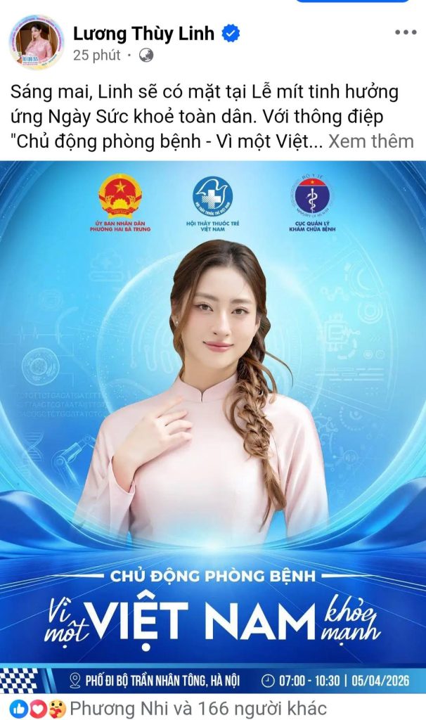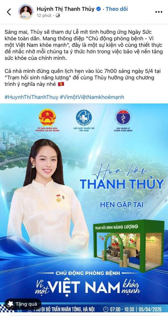 Không khí tại chương trình đi bộ “Vì một Việt Nam khỏe mạnh” diễn ra sáng 05/04/2026 tại phố đi bộ Trần Nhân Tông càng trở nên sôi động và thu hút khi có sự xuất hiện của ba nàng hậu đình đám: Huỳnh Thị Thanh Thủy, Trần Tiểu Vy và Lương Thùy Linh.